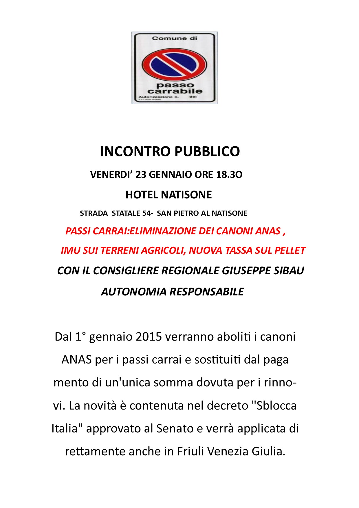 INCONTRO PUBBLICO CON IL CONSIGLIERE SIBAU SULLA NUOVA NORMATIVA CHE RIGUARDA I PASSI CARRAI,L’IMU SUI TERRENI AGRICOLI E LA NUOVA TASSA SUL PELLET.
