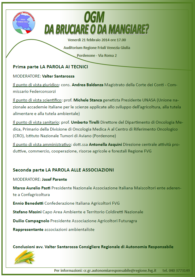 programma convegno ogmÈ questo il tema del convegno organizzato dal Gruppo Autonomia Responsabile in Consiglio regionale e fortemente voluto dal consigliere Valter Santarossa, che si terrà venerdì prossimo, 21 febbraio, a Pordenone, nell’Auditorium della sede della Regione in via Roma 2, alle 17.00.